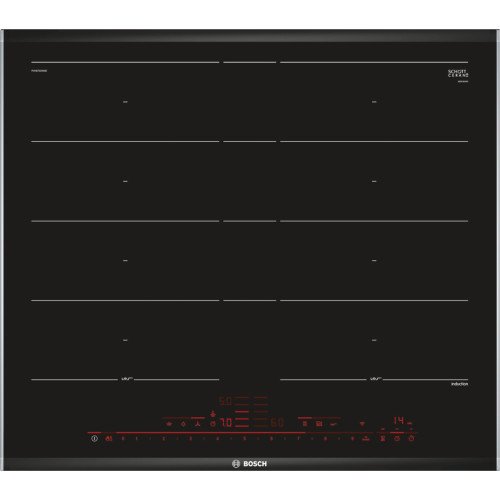 PXY675DW4E là mẫu bếp từ đa điểm của Bosch dáng vuông, lắp đặt âm. Mặt bếp màu đen sang trọng, được phân ra làm 04 vùng nấu có thể kết hợp lại với nhau. Không giống như những mẫu bếp từ khác có ký hiệu các vùng nấu là dấu + hoặc hình tròn, với dòng bếp đa điểm của Bosch có cách thể hiện riêng là các vạch kẻ ngang bếp, đó cũng là cách để phân giữa các dòng bếp thường với bếp đa điểm.