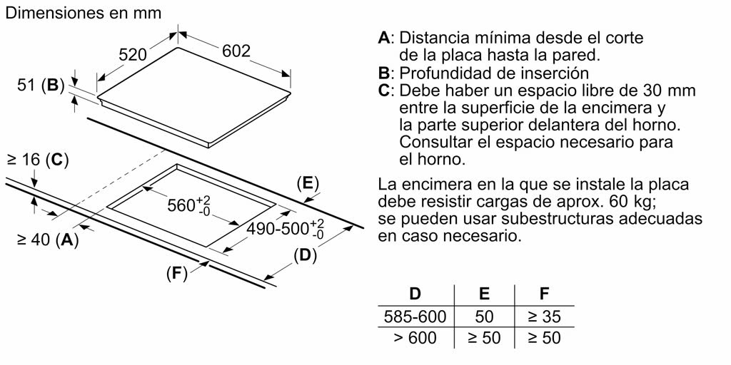 - Kích thước mặt bếp (CxRxS) (mm): 51 x 602 x 520