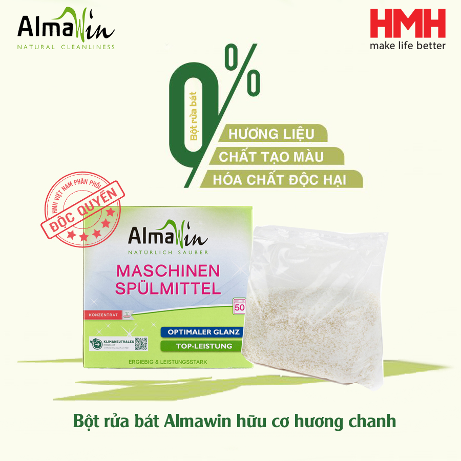 Bột rửa bát Almawin hữu cơ hương chanh là sản phẩm chất tẩy rửa hữu cơ cao cấp đến từ Đức. Với những ưu điểm vượt trội về độ an toàn, hiệu quả và thân thiện với môi trường, bột rửa bát Almawin đã được nhiều người tiêu dùng Việt Nam tin tưởng lựa chọn.