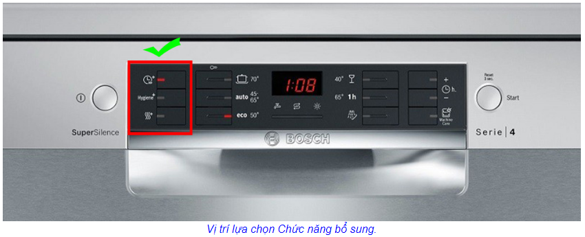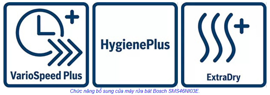 (3) Hygiene Plus – Rửa diệt khuẩn: Là tên của một chương trình rửa cực sạch với nhiệt độ cao hơn để đảm bảo vệ sinh tối đa. Hygiene Plus là một lựa chọn mới có thể được thêm vào nhiều chu kỳ xả và đảm bảo hiệu suất vệ sinh tối đa thông qua việc làm sạch kháng khuẩn. Nhiệt độ nước lên đến 70°C trong quá trình rửa, và được duy trì trong một khoảng thời gian dài hơn.