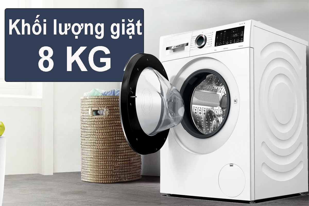 - Máy có khả năng giặt 8 kg có khả năng giặt đồ cho hộ gia đình có từ 4-6 người.
