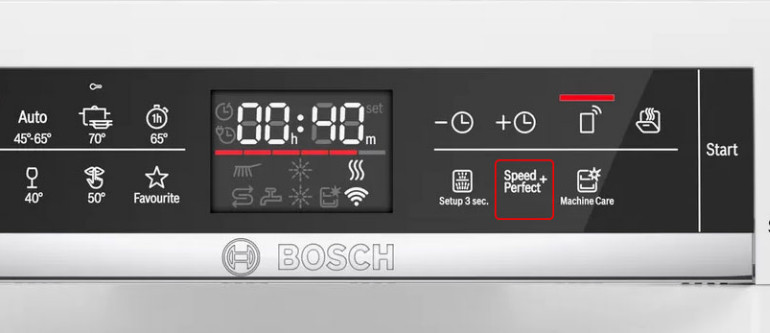 Bạn có thể sử dụng tính năng Speed Perfect + để rửa và làm khô bát đĩa hoàn toàn trong thời gian ngắn nhất. Chỉ cần chạm vào nút thì thời gian rửa có thể giảm tới 75% trong khi vẫn duy trì hiệu quả rửa. Chức năng Speed Perfect + có thể sử dụng được với bất kỳ chương trình rửa dài nào trên máy rửa bát Bosch TGB.SMU6ECS57E