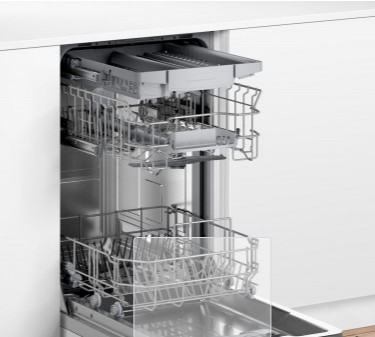 Giàn xếp dao kéo thứ 3 của Máy rửa bát âm tủ BOSCH SRV4XMX16E |Series 4 cung cấp thêm không gian cho các dụng cụ dao kéo lớn. Các tấm bên cạnh là vị trí không gian cho các dụng cụ, cốc nhỏ - lên đến ly espresso. Nhờ các điểm tiếp xúc màu đỏ và các nút màu đỏ, cách điều chỉnh ngăn kéo linh hoạt cho dao kéo có vị trí của nó và xếp được nhiều hơn.