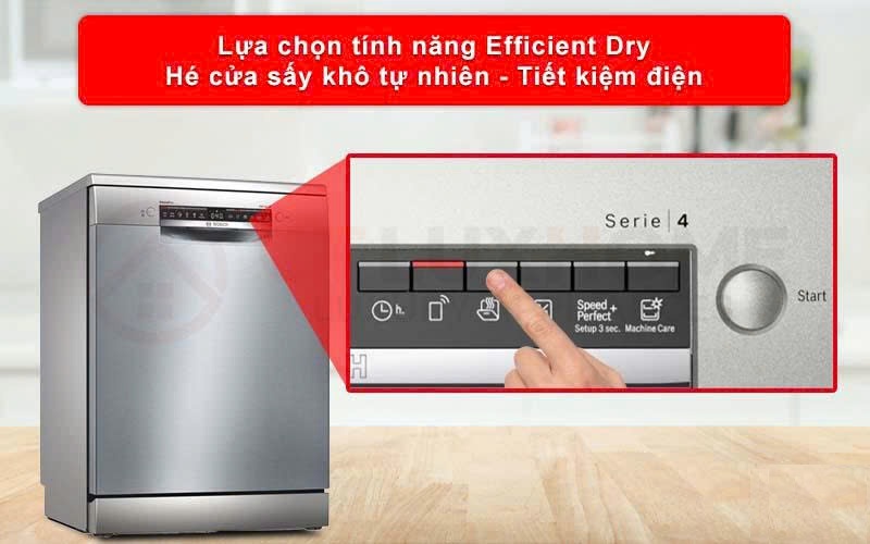 Tuy nhiên, so với các dòng máy rửa bát cũ, Bosch đã cải tiến khi trang bị công nghệ Efficient Dry cho máy rửa chén độc lập SMS4ECI26E. Đây là chương trình sấy hé cửa ở mọi chu trình, khác xa hoàn toàn so với công nghệ cũ vốn chỉ hé cửa ở chương trình Eco 50.