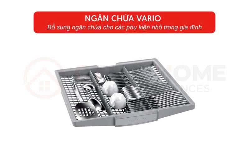Hệ thống ngăn chứa thứ 3 Vario được trang bị trên máy rửa bát serie 4 SMS4ECI26E nhằm thay thế giỏ đựng ngăn dưới cùng trên các dòng 2 giàn. Điều này giúp tối ưu hóa hơn không gian lưu trữ vật dụng. Các vật dụng sẽ được sắp xếp ngăn nắp và khoa học hơn. Đồng thời, ngăn chứa thứ 3 của máy sẽ giúp giải phóng, tăng dung tích đựng ở ngăn dưới cùng.