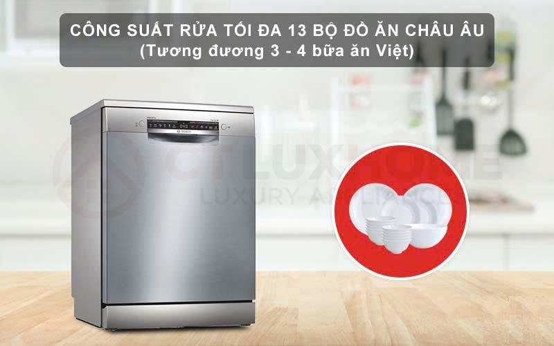 Ngoài ra, máy rửa bát SMS4ECI26E có công suất tối đa 2400W đi cùng khả năng rửa tối đa lên đến 13 bộ đồ ăn châu Âu. Công suất rửa này tương đương với 3-4 bữa ăn Việt trong một gia đình 4-6 người.