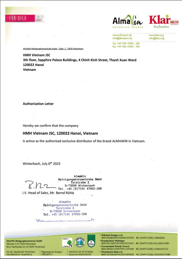 Almawin (Almawin Reinigungskonzentrate GmbH) là một thương hiệu nổi tiếng bởi các sản phẩm chất tẩy rửa, chất làm sạch an toàn và có lợi nhất cho con người, môi trường tại Châu Âu nói chung và tại Đức nói riêng. Almawin được thành lập năm 1933, đến nay hấu hết các sản phẩm Almawin được chứng cấp các chứng nhận hữu cơ dành cho sản phẩm hóa mỹ phẩm như: chứng chỉ GREEN RANDS, chứng nhận sinh thái từ ECOGARANTIE, …